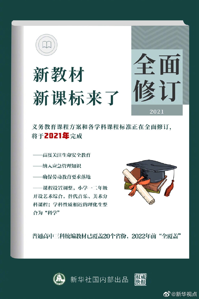 中小學(xué)校開什么課?學(xué)什么?怎么學(xué)?12月24日,教育部召開新聞發(fā)布會介紹,義務(wù)教育課程方案和各學(xué)科課程標(biāo)準(zhǔn)正在全面修訂,將于2021年完成。此外,普通高中道德與法治(思想政治)、語文、歷史三科統(tǒng)編教材已覆蓋20個省份,2022年前將實(shí)現(xiàn)所有省份“全覆蓋”,到2025年實(shí)現(xiàn)所有年級“全覆蓋”。(記者胡浩 海報設(shè)計張晨光)