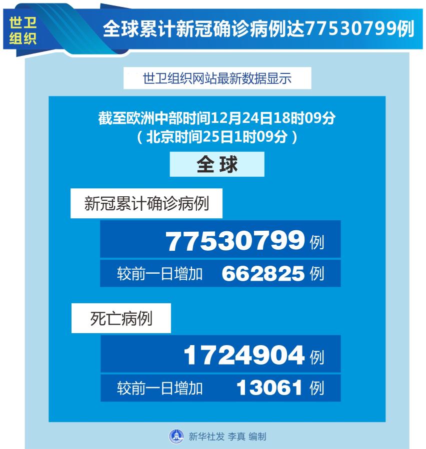 世衛組織網站最新數據顯示,截至歐洲中部時間24日18時09分(北京時間25日1時09分),全球確診病例較前一日增加662825例,達到77530799例;死亡病例增加13061例,達到1724904例。