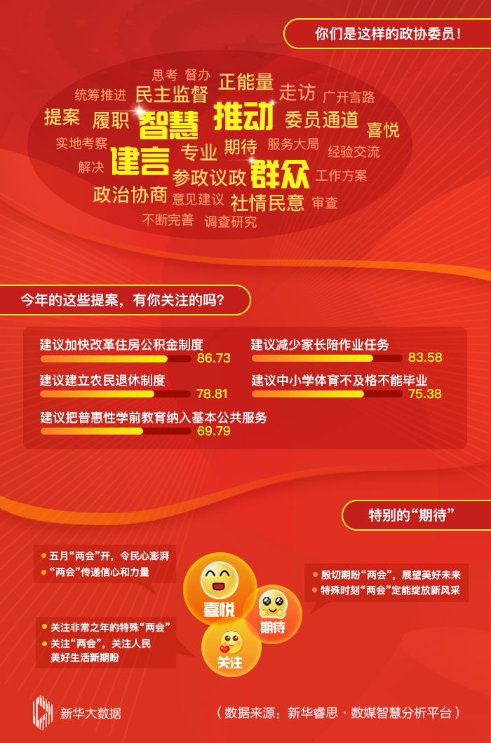 特別的兩會(huì),特別的期待。今年全國(guó)兩會(huì),適逢決勝全面建成小康社會(huì)、決戰(zhàn)脫貧攻堅(jiān)收官之年和“十三五”規(guī)劃收官之年,又是在新冠肺炎疫情防控常態(tài)化的特殊背景下召開,承載著萬(wàn)眾期待。從網(wǎng)絡(luò)互動(dòng)平臺(tái)的情緒感知分析可以看出,對(duì)于2020年“兩會(huì)時(shí)間”的正式開啟,網(wǎng)民充滿“喜悅”和“期待”。