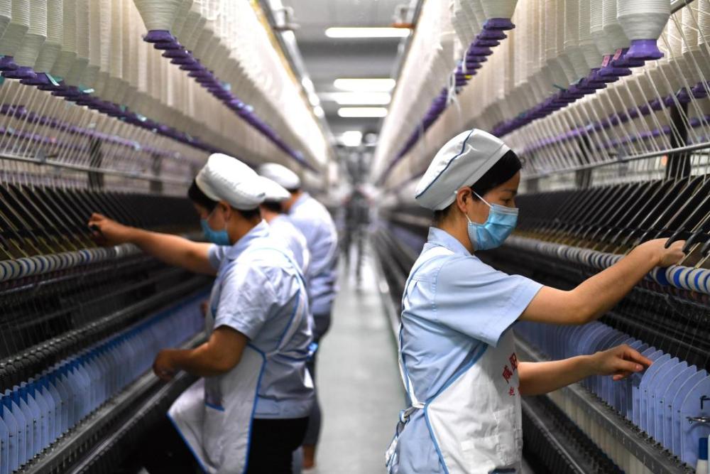 在抗擊新冠肺炎疫情過程中,陜西省咸陽紡織集團有限公司一分廠紡織工人堅守在復工復產一線,搶抓工時完成生產任務。(新華社記者張博文 攝)