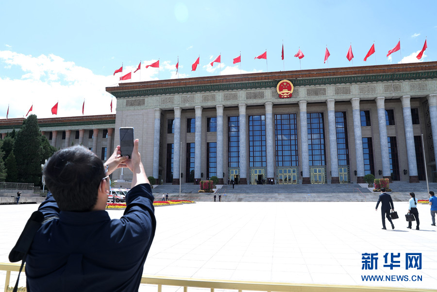 ??? 5月27日,中國人民政治協商會議第十三屆全國委員會第三次會議在北京人民大會堂舉行閉幕會。圖為媒體記者在人民大會堂外拍攝。 新華網 翟子赫 攝