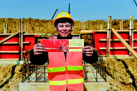 記者見到他時,他穿著橙色馬甲,戴著黃色安全帽,蹲在地上仔細地扎著打地基要用的鋼筋架:一根根鐵絲牢牢綁在鋼筋的接合處,給鋼筋的強度加碼。