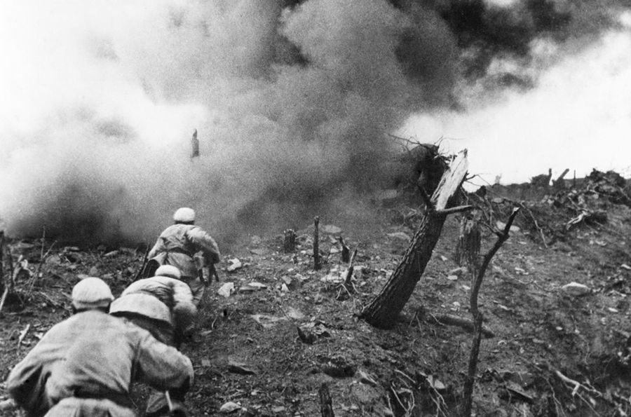 1952年,在上甘嶺戰(zhàn)役中,中國(guó)人民志愿軍指戰(zhàn)員在炮火支援下,攻上537.7高地北山。 新華社圖片