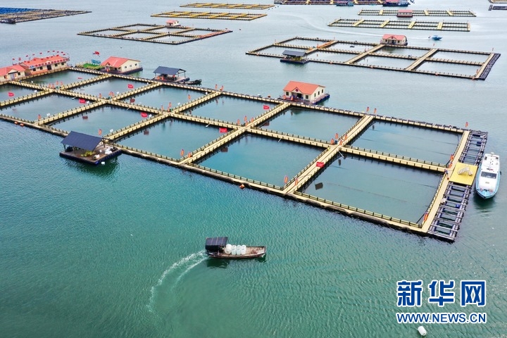 漁船駛過福建省寧德市三都澳大黃魚深水塑膠漁排養殖區(無人機照片,2020年7月15日攝)。新華社記者姜克紅攝