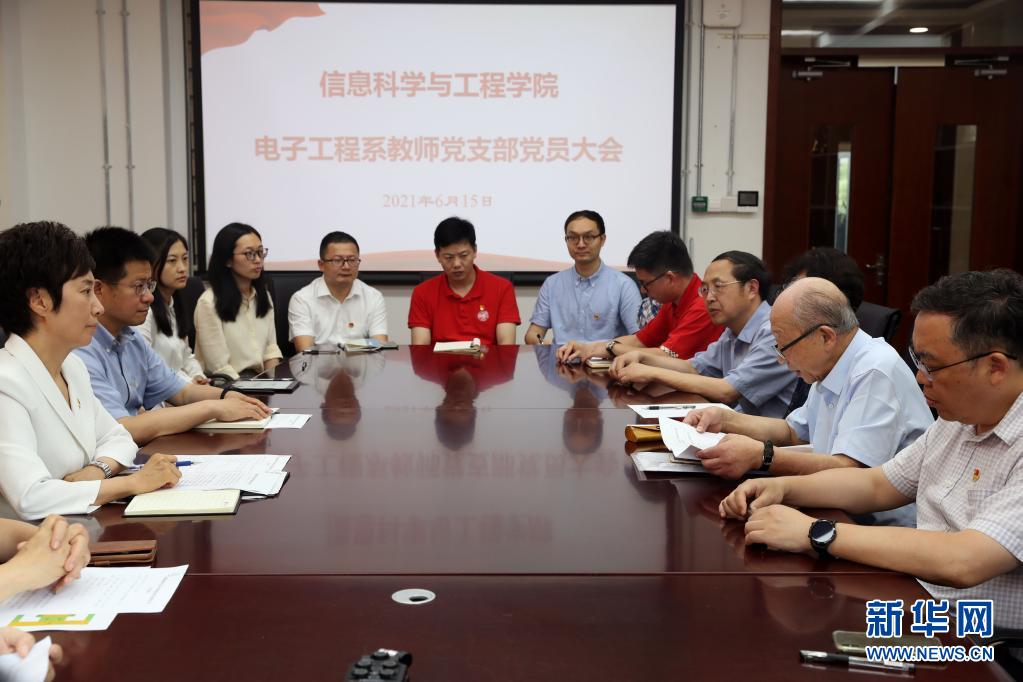 6月15日,在復旦大學信息科學與工程學院電子工程系教師黨支部黨員大會上,陳振新(右二)宣讀自己的入黨志愿書。新華社記者 劉穎 攝