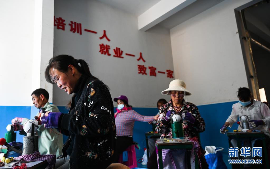 4月26日,搬遷群眾在云南會(huì)澤新城搬遷安置點(diǎn)棒球制作車間內(nèi)工作。新華社記者 王冠森 攝