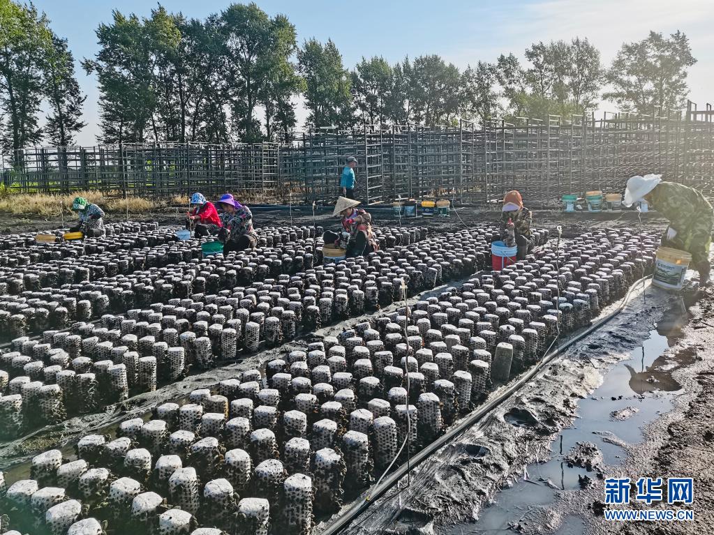 在黑龍江省寶清縣寶清鎮(zhèn)雙泉村的食用菌基地,村民們?cè)诓烧径?月3日攝)。新華社發(fā)