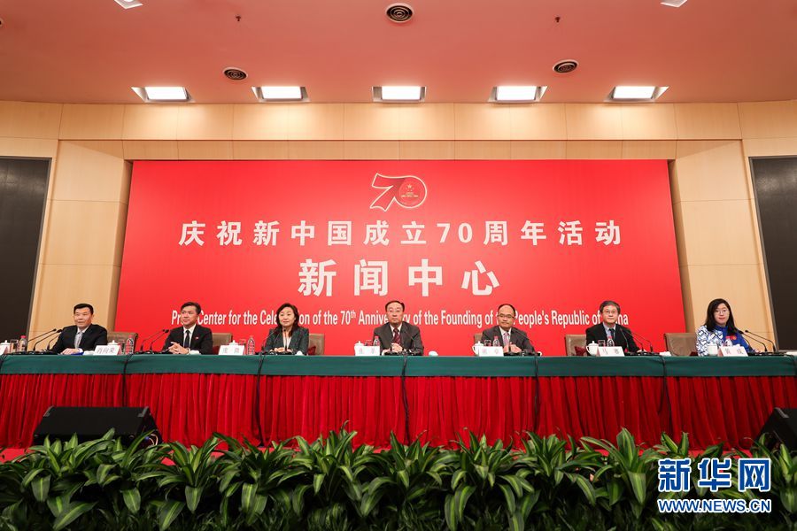 9月25日,慶祝中華人民共和國成立70周年活動新聞中心在北京梅地亞中心二層新聞發布廳舉辦第二場專題集體采訪活動。圖為新聞發布會現場。新華網記者 焦鵬 攝