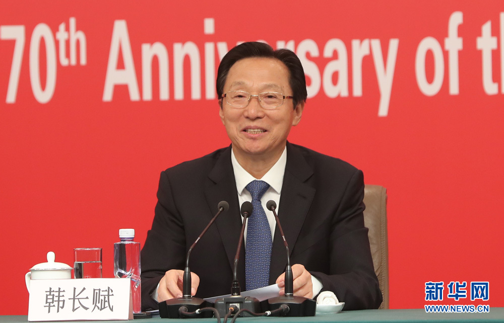 9月27日,慶祝中華人民共和國成立70周年活動新聞中心在梅地亞中心二層新聞發布廳舉辦第三場新聞發布會,中央農村工作領導小組辦公室主任、農業農村部部長韓長賦,國務院扶貧開發領導小組辦公室主任劉永富介紹全面建成小康社會,扎實推進脫貧攻堅和鄉村振興,并回答記者提問。圖為韓長賦介紹有關情況。新華網 陳杰 攝