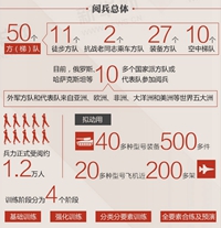 這次閱兵,我軍共編50個方(梯)隊。其中,徒步方隊11個,抗戰老同志乘車方隊2個、裝備方隊27個、空中梯隊10個,兵力正式受閱約1.2萬人,擬動用40多種型號裝備500多件、20多種型號飛機近200架……