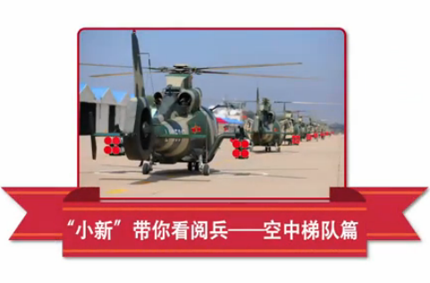 方隊由26架直升機和7架教練機組成。國旗和軍旗分別由1架直升機在正下方懸掛、由2架直升機護衛,組成兩組三機梯隊,呈品字形依次通過。緊隨其后的是由20架直升機組成“70”字樣,寓意中華民族以抗戰勝利為起點走向偉大復興的征程。這是我國在閱兵中首次采用紀念數字的編隊飛行。