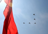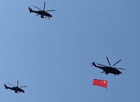中國利用神舟飛船返回著陸的降落傘技術制造了巨幅國旗和軍旗。9月3日紀念抗戰勝利70周年的大閱兵中,直升機懸掛著這兩面旗幟,以每小時180公里的速度飛過天安門。國旗長9米、寬6米,軍旗長7.5米、寬6米。這是中國首次懸掛如此巨大的旗幟,以如此高的速度飛行展示。