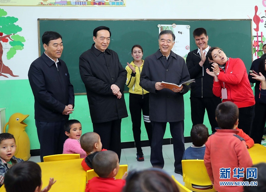 4月10日至14日,中共中央政治局常委、全國政協(xié)主席汪洋在新疆調研。這是4月11日,汪洋來到和田縣村里的幼兒園看望孩子。 新華社記者劉衛(wèi)兵 攝