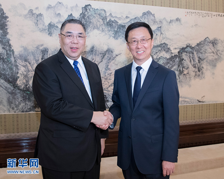 韓正充分肯定了崔世安行政長官領導的特區政府的工作。他表示,建設粵港澳大灣區是習近平總書記親自謀劃、親自部署、親自推動的國家戰略。要以習近平新時代中國特色社會主義思想為指導,全面準確貫徹“一國兩制”方針,嚴格依照憲法和基本法辦事,著力促進粵港澳優勢互補、合作共贏、協同發展,讓大灣區廣大人民群眾共享發展成果。希望澳門抓住歷史性機遇,發揮好“一個中心”“一個平臺”的優勢,積極參與粵港澳大灣區建設。