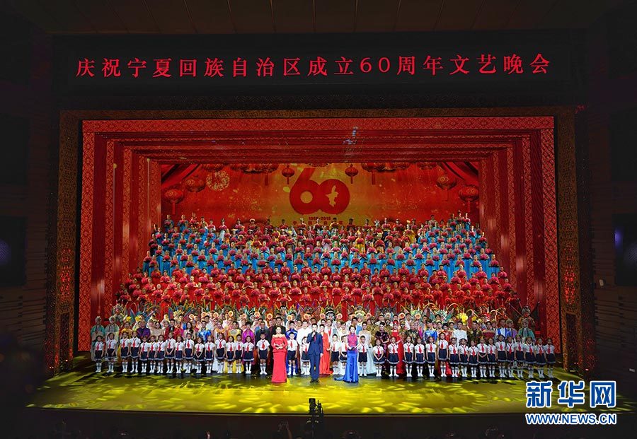 9月19日,慶祝寧夏回族自治區(qū)成立60周年文藝晚會(huì)《綻放新時(shí)代》在寧夏人民劇院上演。中共中央政治局常委、全國(guó)政協(xié)主席、中央代表團(tuán)團(tuán)長(zhǎng)汪洋和各族各界干部群眾等共約1400人觀看演出。 新華社記者 邢廣利 攝