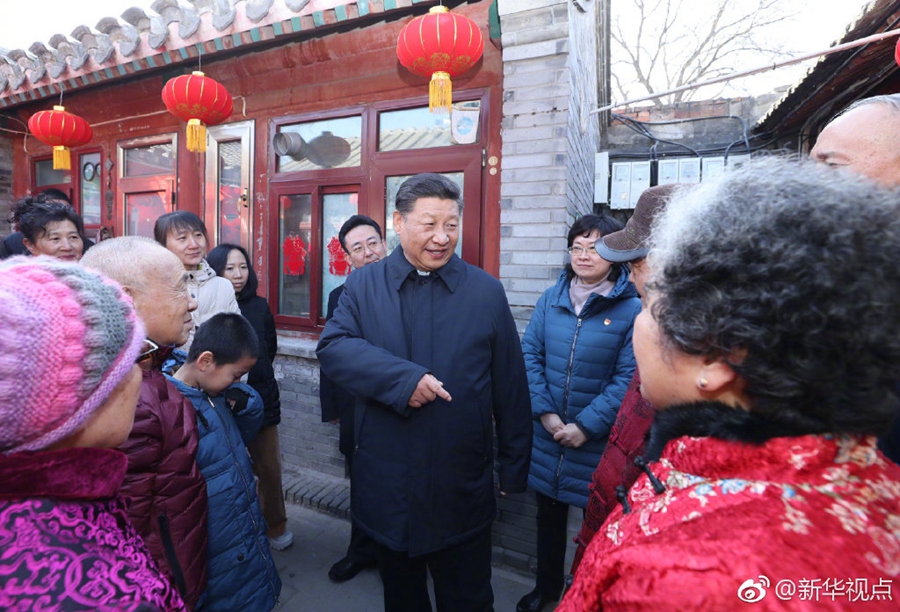 2月1日上午,習近平來到前門東區,沿草廠四條胡同步行察看街巷風貌,聽取區域規劃建設、舊城保護整治、人居環境改善等情況介紹,先后走進兩個四合院看望,同這里的居民一起包餃子、炸饹馇、貼“福”字、聊家常,仔細詢問住房環境有沒有改善、年貨備齊沒有、生活還有什么困難,祝他們生活幸福、新春快樂。四合院里笑語歡聲,習近平對他們說,中國共產黨的追求就是讓老百姓生活越來越好。(記者張曉松、鞠鵬)