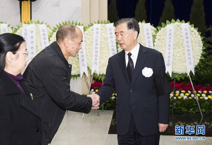 上午9時許,汪洋等在哀樂聲中緩步來到毛致用同志的遺體前肅立默哀,向毛致用同志的遺體三鞠躬,并與毛致用同志親屬一一握手,轉達習近平總書記等中央領導同志對毛致用同志親屬的深切慰問。