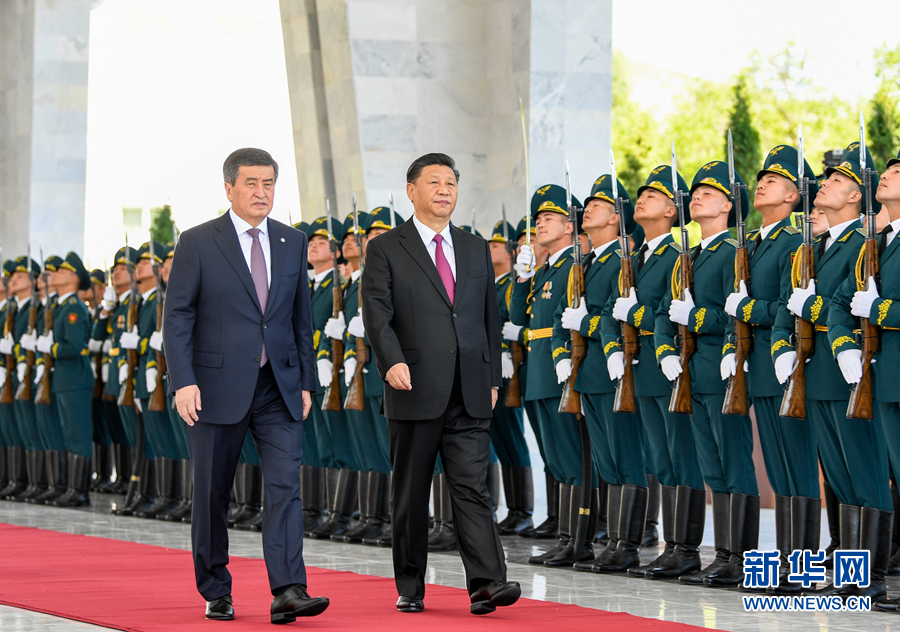 6月13日,國家主席習近平在比什凱克同吉爾吉斯斯坦總統熱恩別科夫會談。會談前,熱恩別科夫在阿拉爾恰國賓館會議中心前廣場為習近平舉行隆重歡迎儀式。這是兩國元首檢閱儀仗隊。 新華社記者 高潔 攝