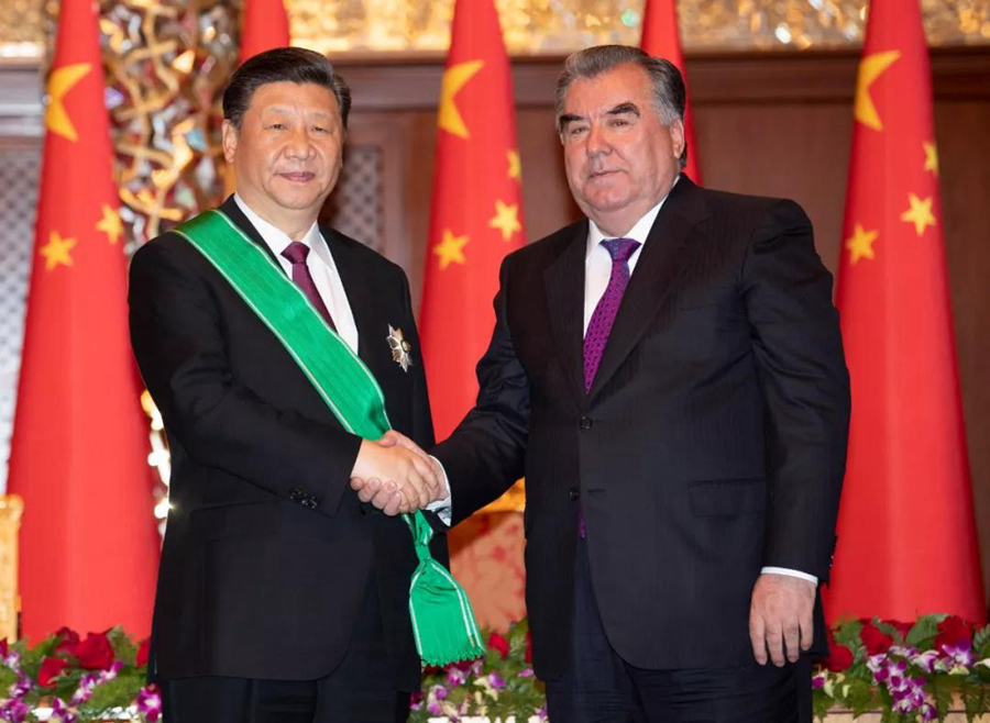 ↑熱恩別科夫總統和拉赫蒙總統分別向習主席授予各自國家最高獎章,感謝習主席為發展吉中、塔中友誼所作的卓越貢獻。照片分別由新華社記者謝環馳、沙達提攝