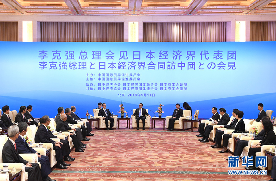 新華社北京9月11日電(記者朱超)國務院總理李克強11日下午在釣魚臺國賓館會見日中經濟協會會長宗岡正二、日本商工會議所會長三村明夫、日本經濟團體聯合會審議員會議長古賀信行率領的日本經濟界代表團并同他們座談交流。日本主要企業負責人200余人出席。