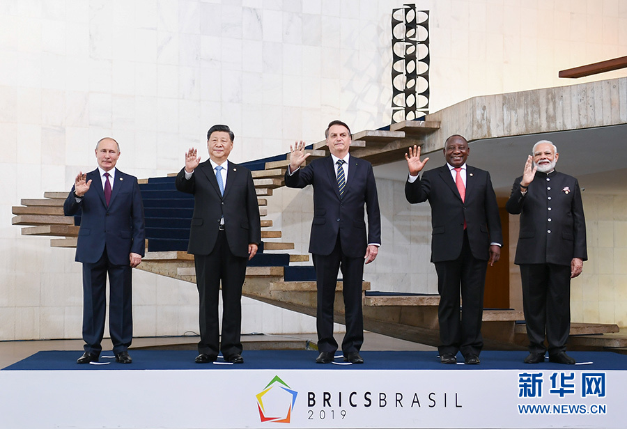 當(dāng)?shù)貢r間11月14日,金磚國家領(lǐng)導(dǎo)人第十一次會晤在巴西首都巴西利亞舉行。巴西總統(tǒng)博索納羅主持會晤。中國國家主席習(xí)近平、俄羅斯總統(tǒng)普京、印度總理莫迪、南非總統(tǒng)拉馬福薩出席。這是五國領(lǐng)導(dǎo)人合影。 新華社記者 謝環(huán)馳 攝
