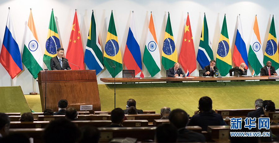 當地時間11月14日,金磚國家領導人同金磚國家工商理事會和新開發銀行對話會在巴西利亞舉行。中國國家主席習近平、巴西總統博索納羅、俄羅斯總統普京、印度總理莫迪、南非總統拉馬福薩共同出席。這是習近平發表講話。 新華社記者 張領 攝