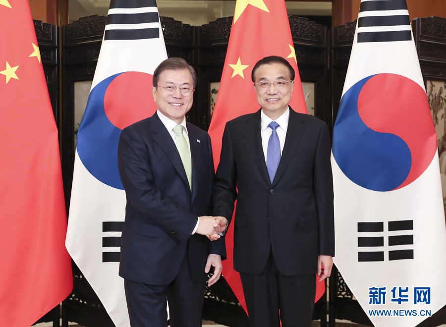 12月23日,國務(wù)院總理李克強(qiáng)在四川成都會(huì)見出席第八次中日韓領(lǐng)導(dǎo)人會(huì)議的韓國總統(tǒng)文在寅。新華社記者 丁海濤 攝