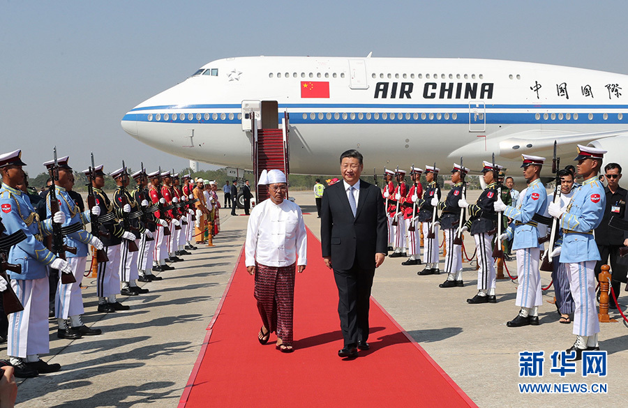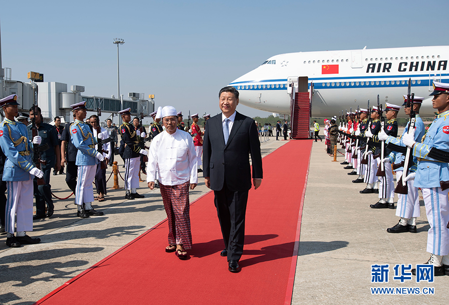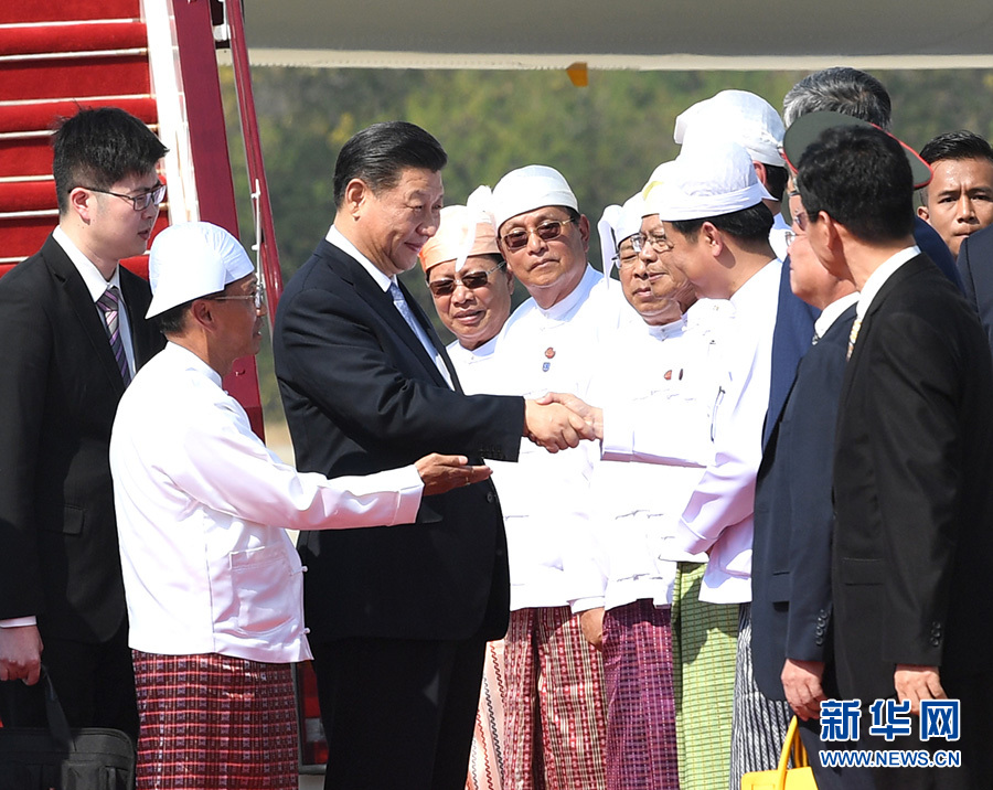 習近平抵達時,緬甸第一副總統敏瑞率多名內閣部長在舷梯旁熱情迎接。緬甸少年兒童向習近平獻花。身著各民族傳統服裝的緬甸青年夾道歡迎。禮兵分列紅地毯兩側致意。當地藝術家和大學生們表演具有濃郁民族特色的傳統歌舞。緬甸青少年揮動中緬兩國國旗,用緬文歡呼“中緬友誼萬歲”“習主席身體健康”,向習近平表達最誠摯的歡迎。習近平微笑著向他們揮手致意。