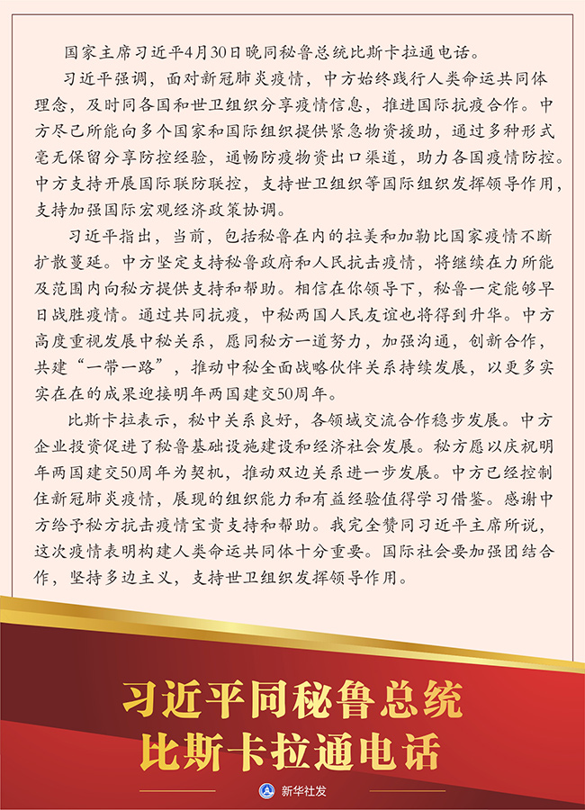 習近平指出,當前,包括秘魯在內(nèi)的拉美和加勒比國家疫情不斷擴散蔓延。中方堅定支持秘魯政府和人民抗擊疫情,將繼續(xù)在力所能及范圍內(nèi)向秘方提供支持和幫助。相信在你領(lǐng)導下,秘魯一定能夠早日戰(zhàn)勝疫情。通過共同抗疫,中秘兩國人民友誼也將得到升華。中方高度重視發(fā)展中秘關(guān)系,愿同秘方一道努力,加強溝通,創(chuàng)新合作,共建“一帶一路”,推動中秘全面戰(zhàn)略伙伴關(guān)系持續(xù)發(fā)展,以更多實實在在的成果迎接明年兩國建交50周年。