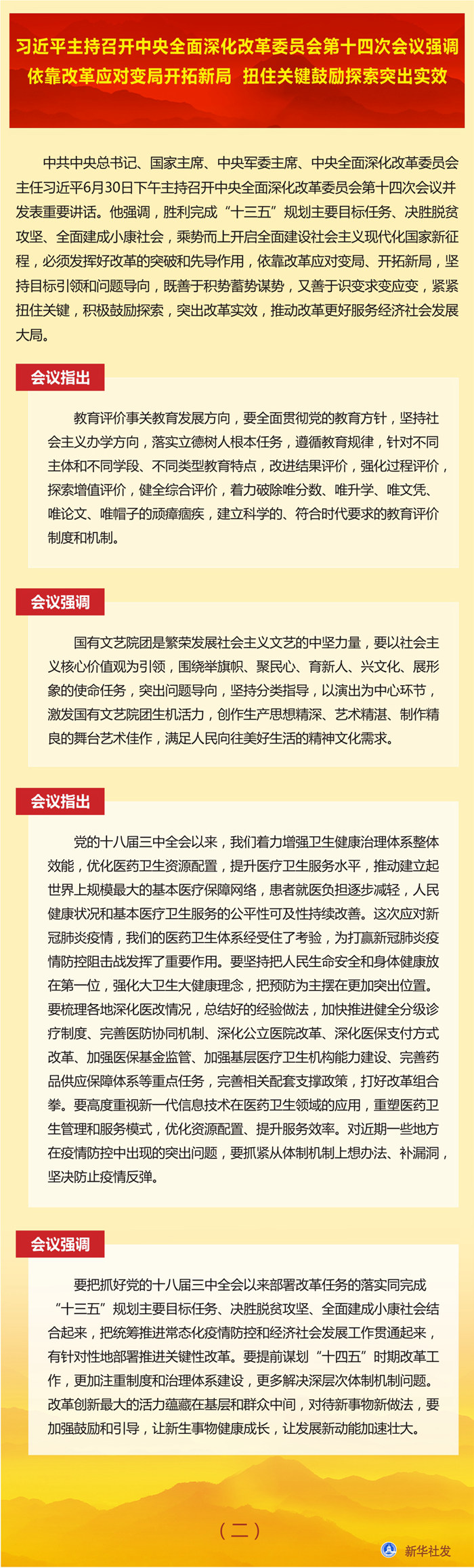 新華社北京6月30日電? 中共中央總書記、國家主席、中央軍委主席、中央全面深化改革委員會主任習近平6月30日下午主持召開中央全面深化改革委員會第十四次會議并發表重要講話。他強調,勝利完成“十三五”規劃主要目標任務、決勝脫貧攻堅、全面建成小康社會,乘勢而上開啟全面建設社會主義現代化國家新征程,必須發揮好改革的突破和先導作用,依靠改革應對變局、開拓新局,堅持目標引領和問題導向,既善于積勢蓄勢謀勢,又善于識變求變應變,緊緊扭住關鍵,積極鼓勵探索,突出改革實效,推動改革更好服務經濟社會發展大局。