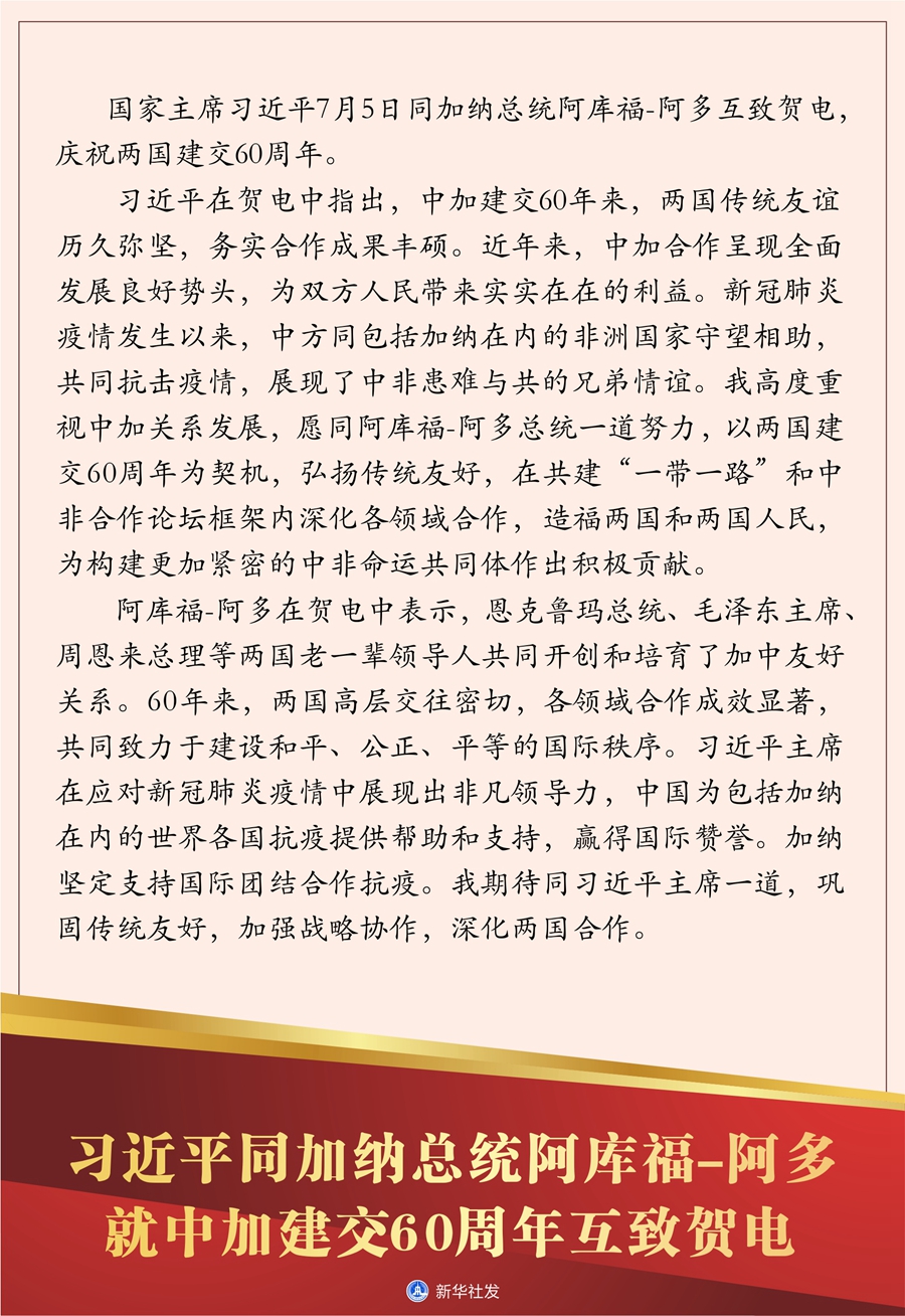 新華社北京7月5日電? 國(guó)家主席習(xí)近平7月5日同加納總統(tǒng)阿庫(kù)福-阿多互致賀電,慶祝兩國(guó)建交60周年。