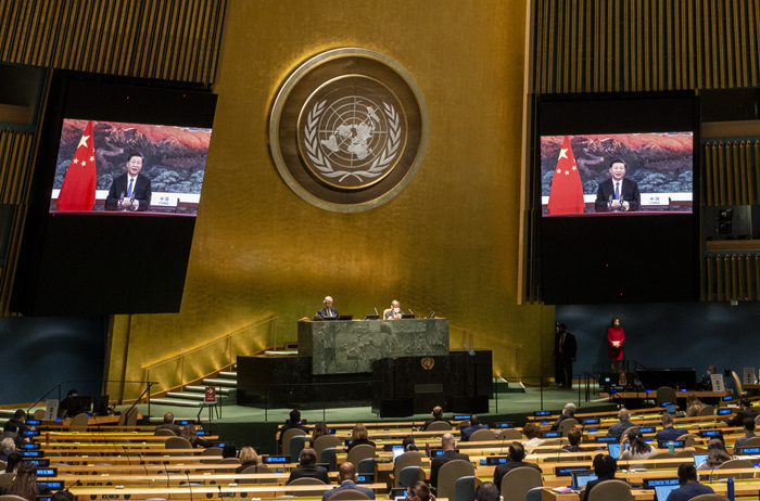 9月22日,國家主席習近平在第七十五屆聯合國大會一般性辯論上發表重要講話。新華社發(聯合國供圖/埃瑟金德爾·德貝貝 攝)