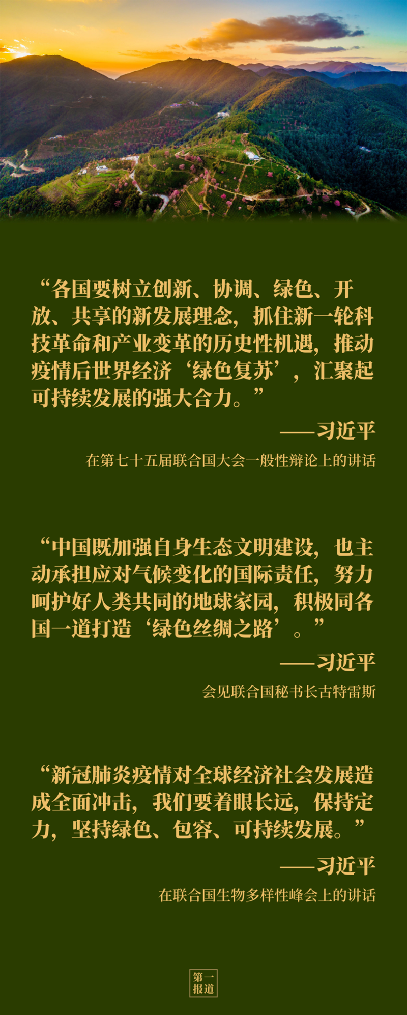 “創新、協調、綠色、開放、共享的新發展理念”“綠色復蘇”“綠色絲綢之路”……梳理習主席出席聯合國成立75周年系列高級別會議期間一系列重要論述,“綠色”是出現頻率最高的關鍵詞之一。