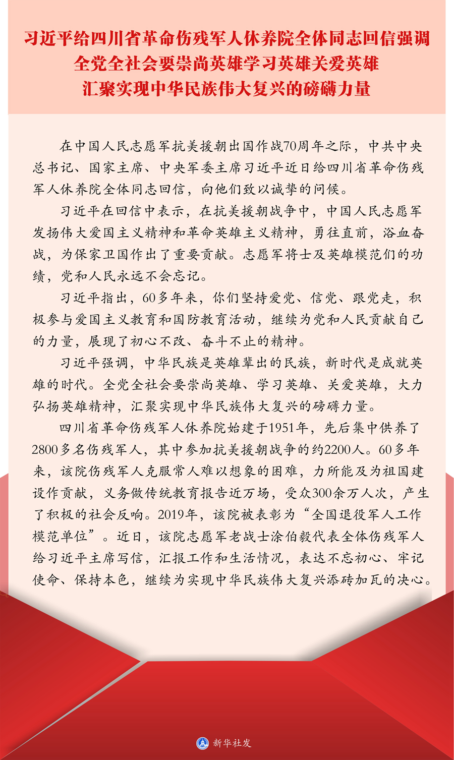 新華社北京10月21日電 在中國人民志愿軍抗美援朝出國作戰(zhàn)70周年之際,中共中央總書記、國家主席、中央軍委主席習近平近日給四川省革命傷殘軍人休養(yǎng)院全體同志回信,向他們致以誠摯的問候。