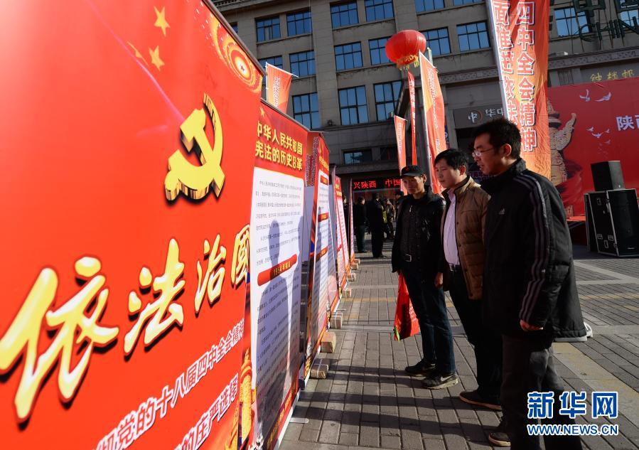 西安市民在國家憲法日宣傳活動現場觀看依法治國宣傳展板(2014年12月4日攝)。新華社記者 李一博 攝
