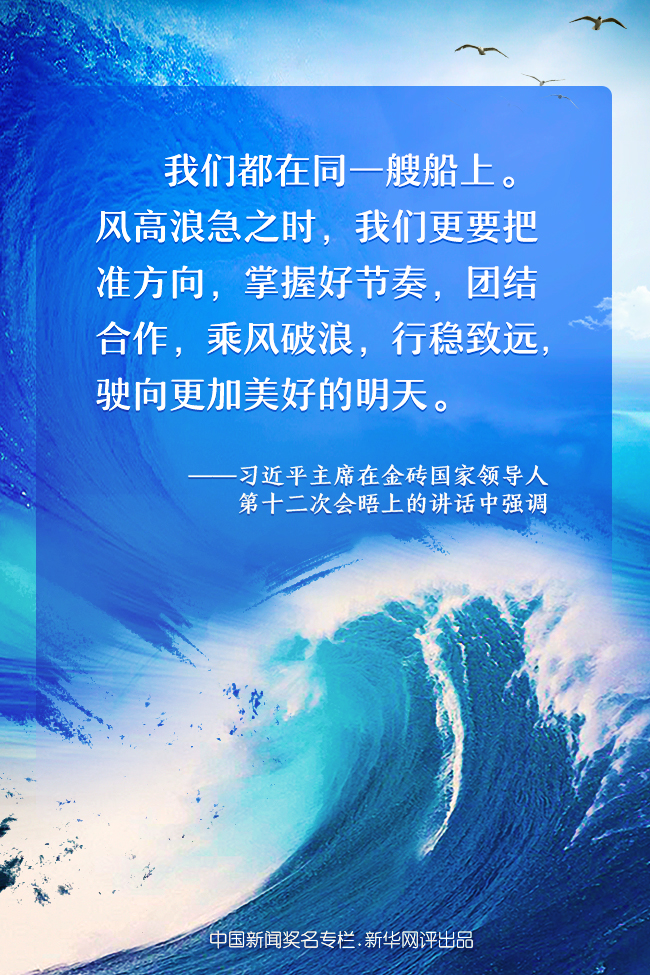 金磚國(guó)家領(lǐng)導(dǎo)人第十二次會(huì)晤17日晚以視頻方式舉行。習(xí)近平主席發(fā)表題為《守望相助共克疫情 攜手同心推進(jìn)合作》的重要講話時(shí)強(qiáng)調(diào),我們都在同一艘船上。風(fēng)高浪急之時(shí),我們更要把準(zhǔn)方向,掌握好節(jié)奏,團(tuán)結(jié)合作,乘風(fēng)破浪,行穩(wěn)致遠(yuǎn),駛向更加美好的明天。