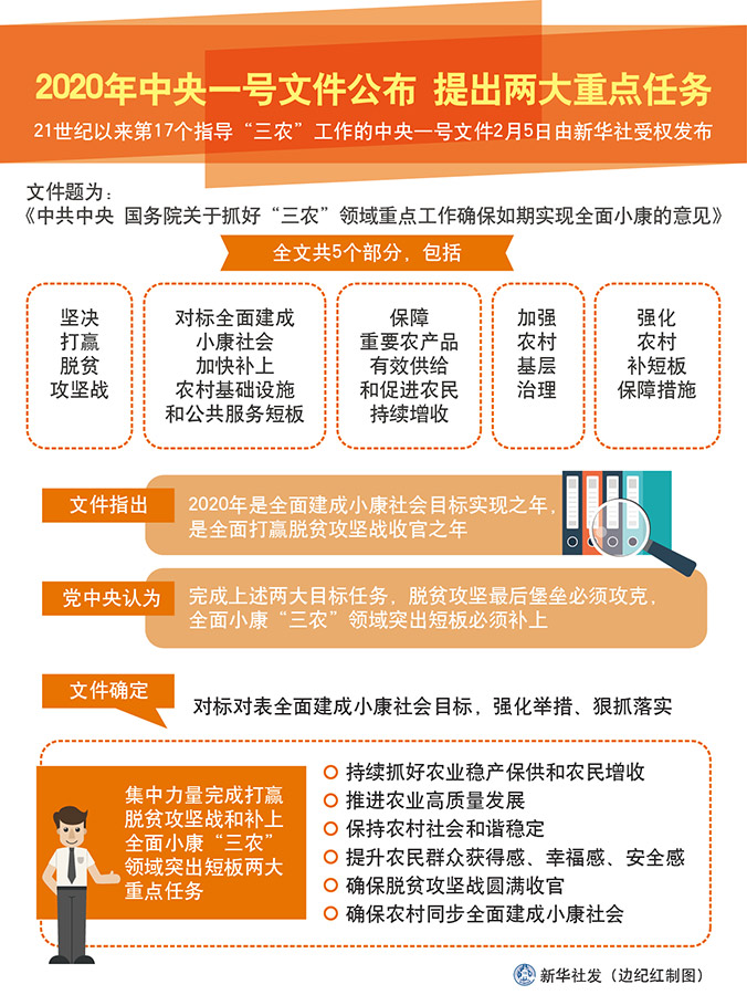 文件確定,對標(biāo)對表全面建成小康社會(huì)目標(biāo),強(qiáng)化舉措、狠抓落實(shí),集中力量完成打贏脫貧攻堅(jiān)戰(zhàn)和補(bǔ)上全面小康“三農(nóng)”領(lǐng)域突出短板兩大重點(diǎn)任務(wù),持續(xù)抓好農(nóng)業(yè)穩(wěn)產(chǎn)保供和農(nóng)民增收,推進(jìn)農(nóng)業(yè)高質(zhì)量發(fā)展,保持農(nóng)村社會(huì)和諧穩(wěn)定,提升農(nóng)民群眾獲得感、幸福感、安全感,確保脫貧攻堅(jiān)戰(zhàn)圓滿收官,確保農(nóng)村同步全面建成小康社會(huì)。