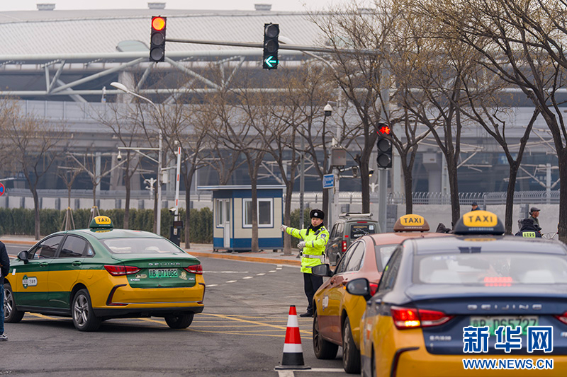 1月30日,北京南站南广场落客区正式启用,全面向社会车辆开放落客功能。北京铁路公安处交通管理支队民警正在疏导交通。新华网记者 钟奕摄