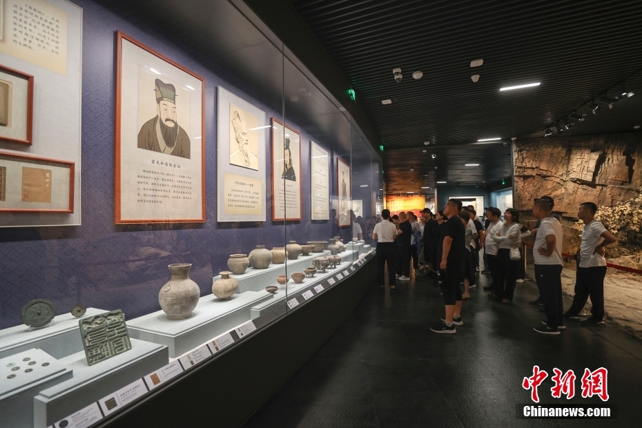 7月18日,山西运城,市民在参观明代万历年间的“河东盐池之图”刻石。河东池盐博物馆通过介绍盐池形成、盐业发展变迁等内容,集中展示盐文化发展历程。中新社记者 张云 摄
