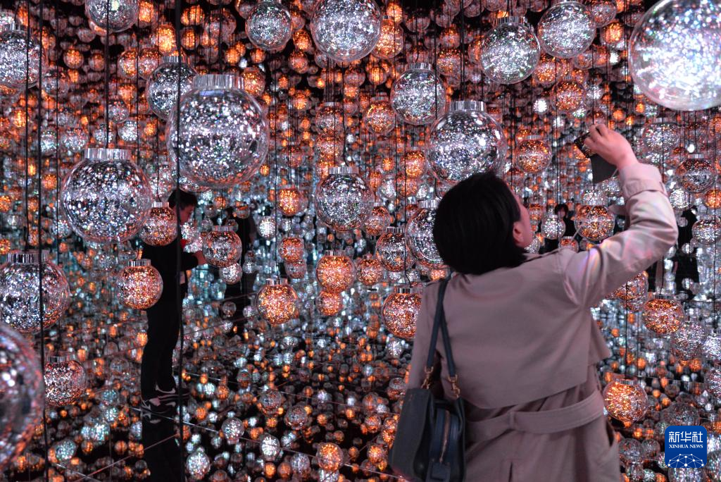 11月20日,在日本东京“teamLab无界”美术馆的媒体预览活动上,一名参观者拍摄艺术作品“泡泡宇宙”。