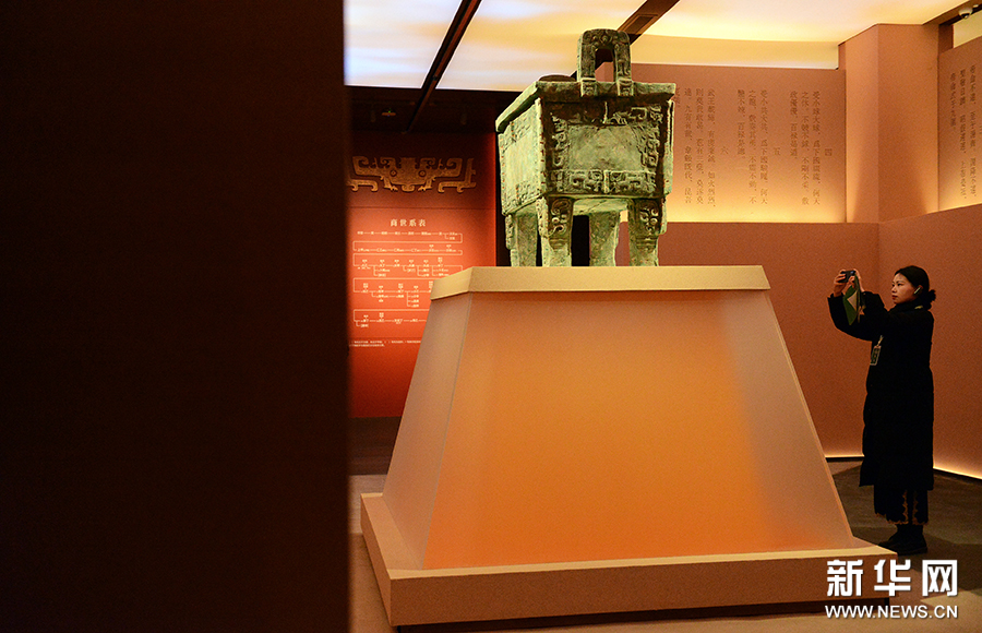 2月26日,河南省安阳市殷墟博物馆新馆,游客在拍摄展品。
