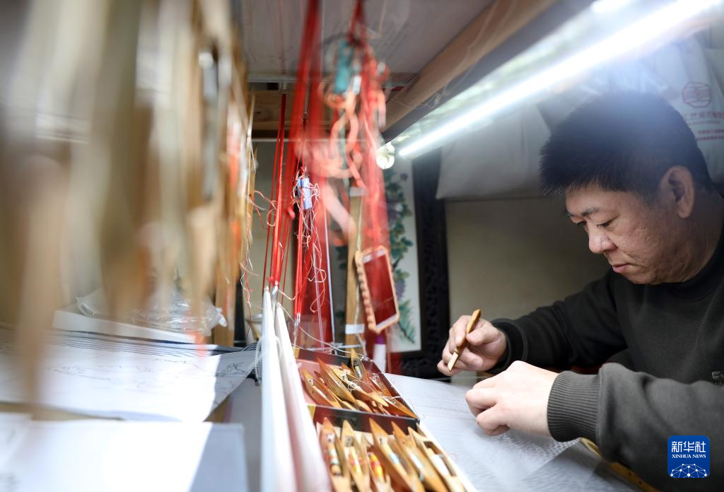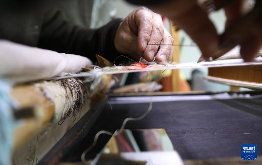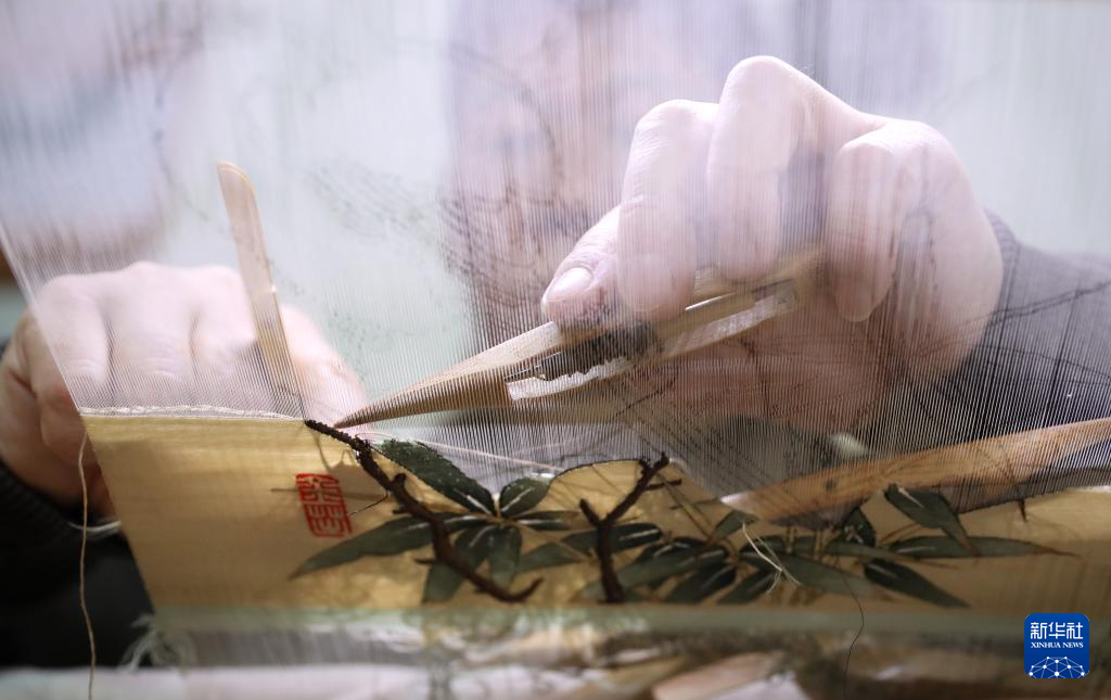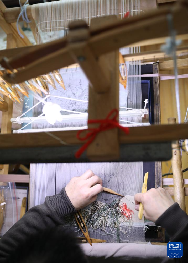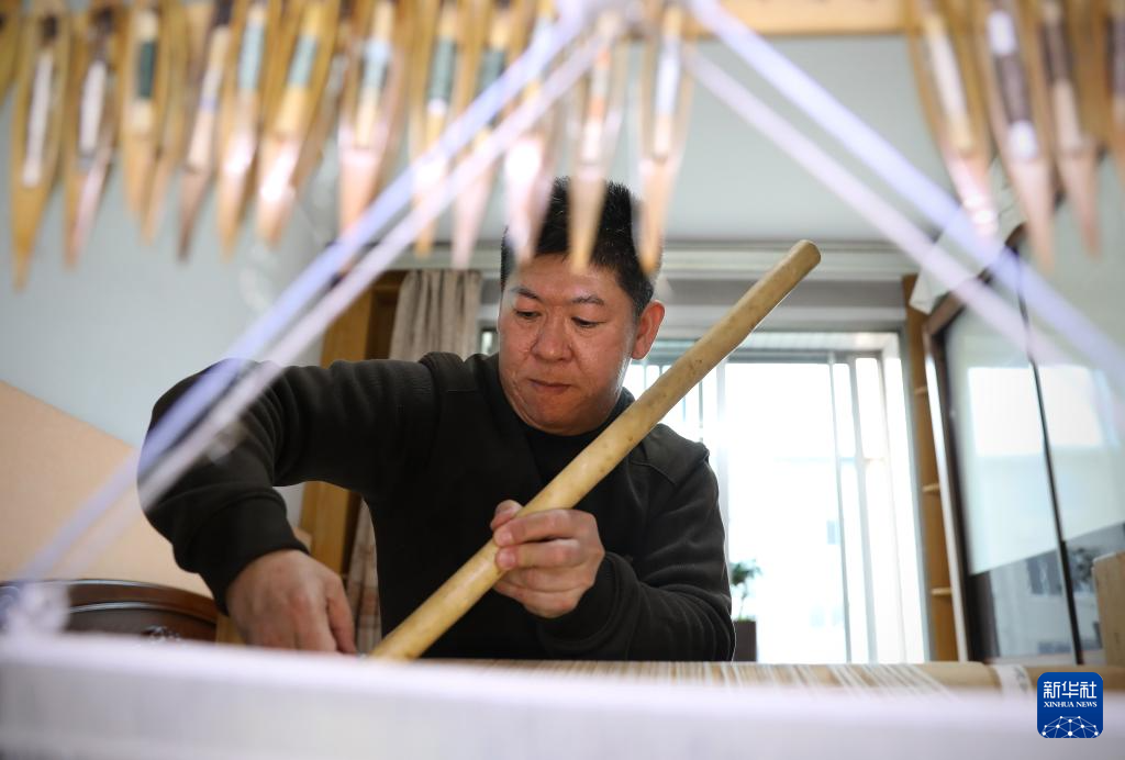 4月9日,在位于营口市的家中,申涛左手拿着缠着丝线的梭子,右手拿着梳理丝线的拨子进行缂丝作品创作。