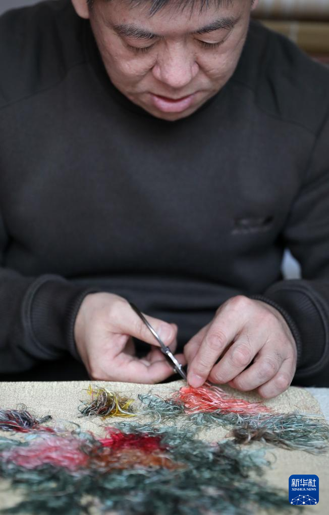 4月9日,申涛在位于营口市的家中对缂丝作品进行最后一道工序——修毛头。