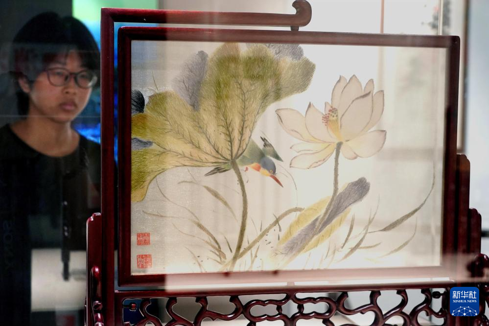 6月10日,小朋友在郑州商代都城遗址博物院里观看苏州园林美学展上展出的苏绣。