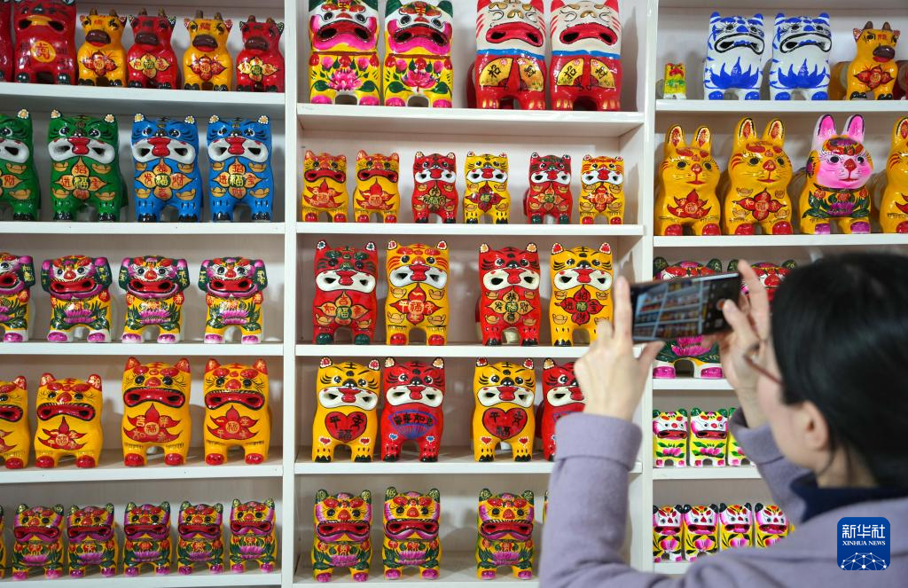 3月19日拍摄的姜庄镇的一家工坊内陈列的泥老虎产品。