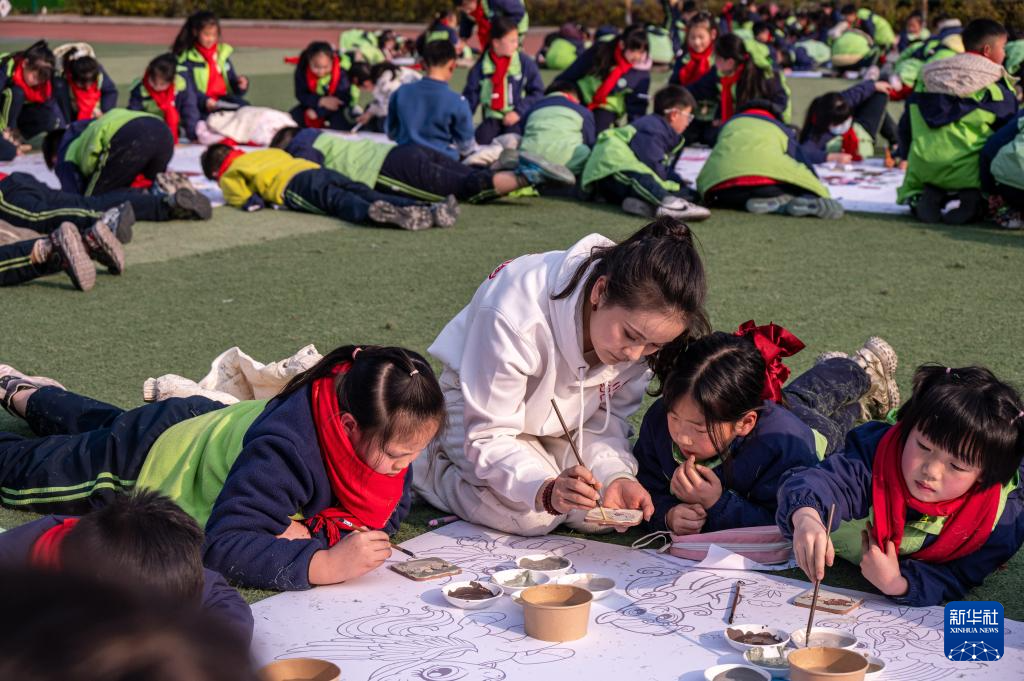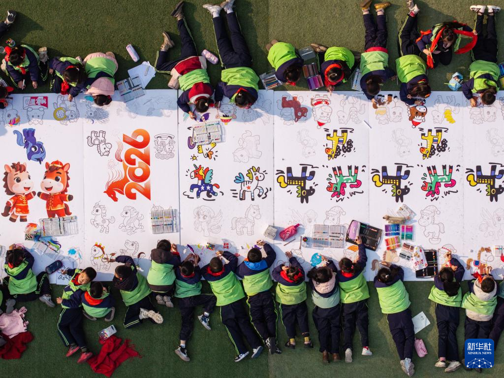 1月14日,四川省自贡市荣县树人小学校操场上,千余名师生共同在巨型“马”字轮廓的画布上创作,以纸绘、陶板绘等形式画出各式生肖马。