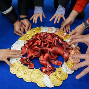 12月14日,上海轮椅击剑队队员、领队和教练在展示上海队获得的轮椅击剑奖牌。新华社记者 侯俊 摄