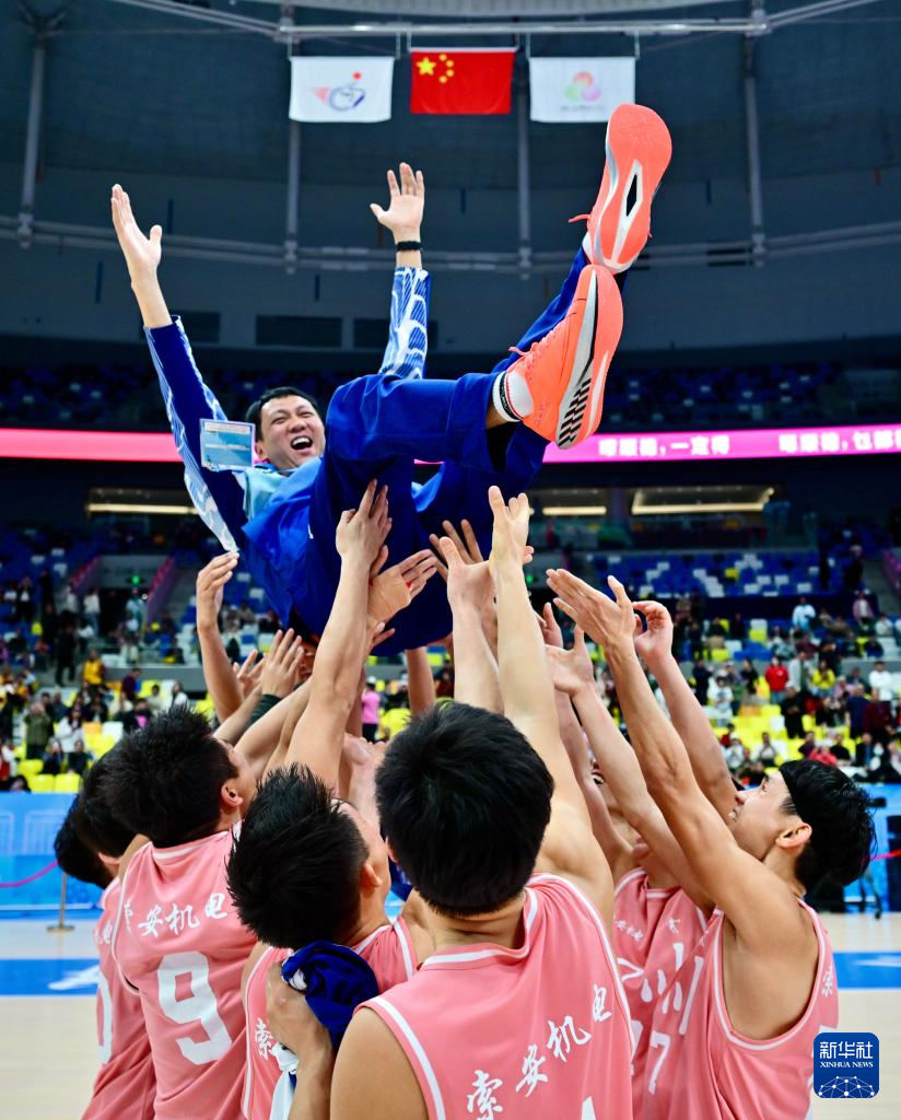 12月15日,四川队教练刘强(上)被球员抛向空中庆祝夺冠。