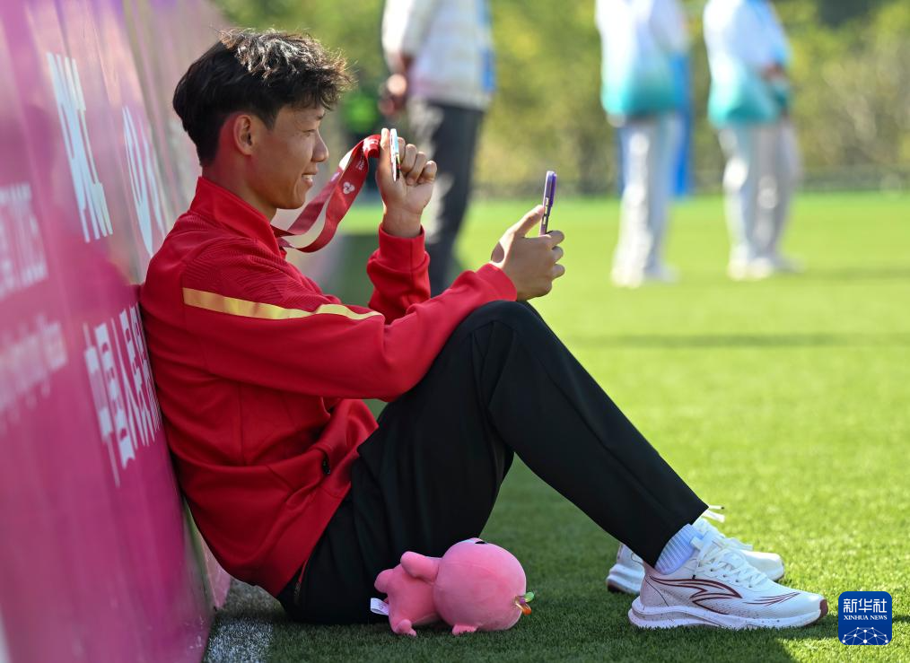 12月15日,福建队守门员王世奥在颁奖仪式后与家人视频通话并展示奖牌。