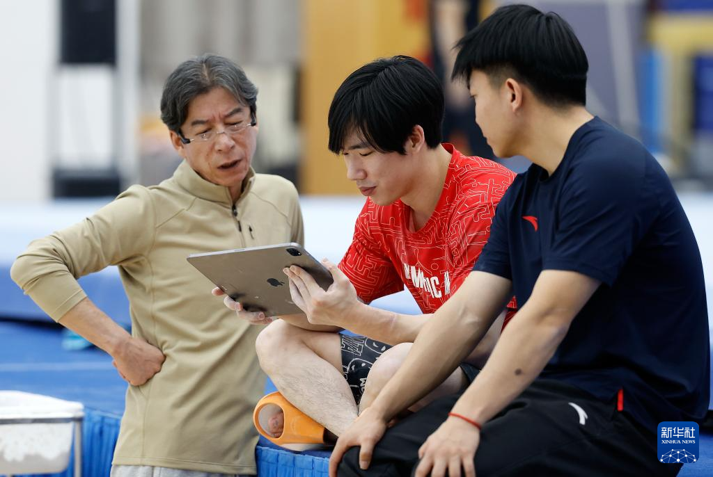 1月31日,张博恒(中)与中国男子体操队教练组组长金卫国(左)一起查看训练录像。